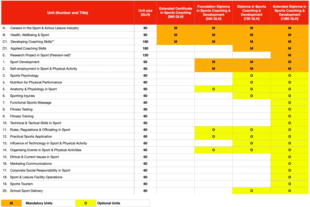 The Pearson Level 3 National Extended Diploma in Sports Coaching & Development is 180 credits & has 1080 Guided Learning Hours (GLH). It consists of SEVEN mandatory units plus FIVE optional units for a combined total of 180 credits. Equivalent to 3 A Levels.